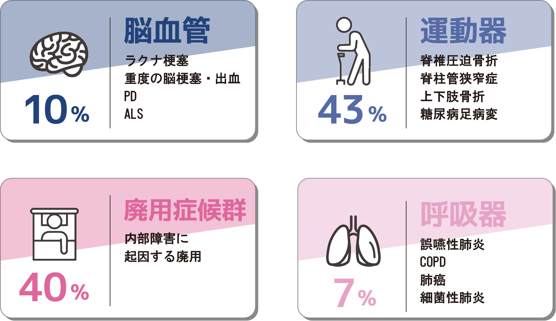 また、当院は脳血管疾患、廃用症候群、呼吸器疾患、運動器疾患のリハビリテーションにおいて、「リハビリテーション料Ⅰ」の施設基準を満たしており、専門のスタッフが豊富な経験と知識を活かして、個別のリハビリプログラムを作成しています。早期の機能回復を目指すだけでなく、生活の質(QOL)の維持・向上にも力を入れ、きめ細やかなサポートを提供しています。