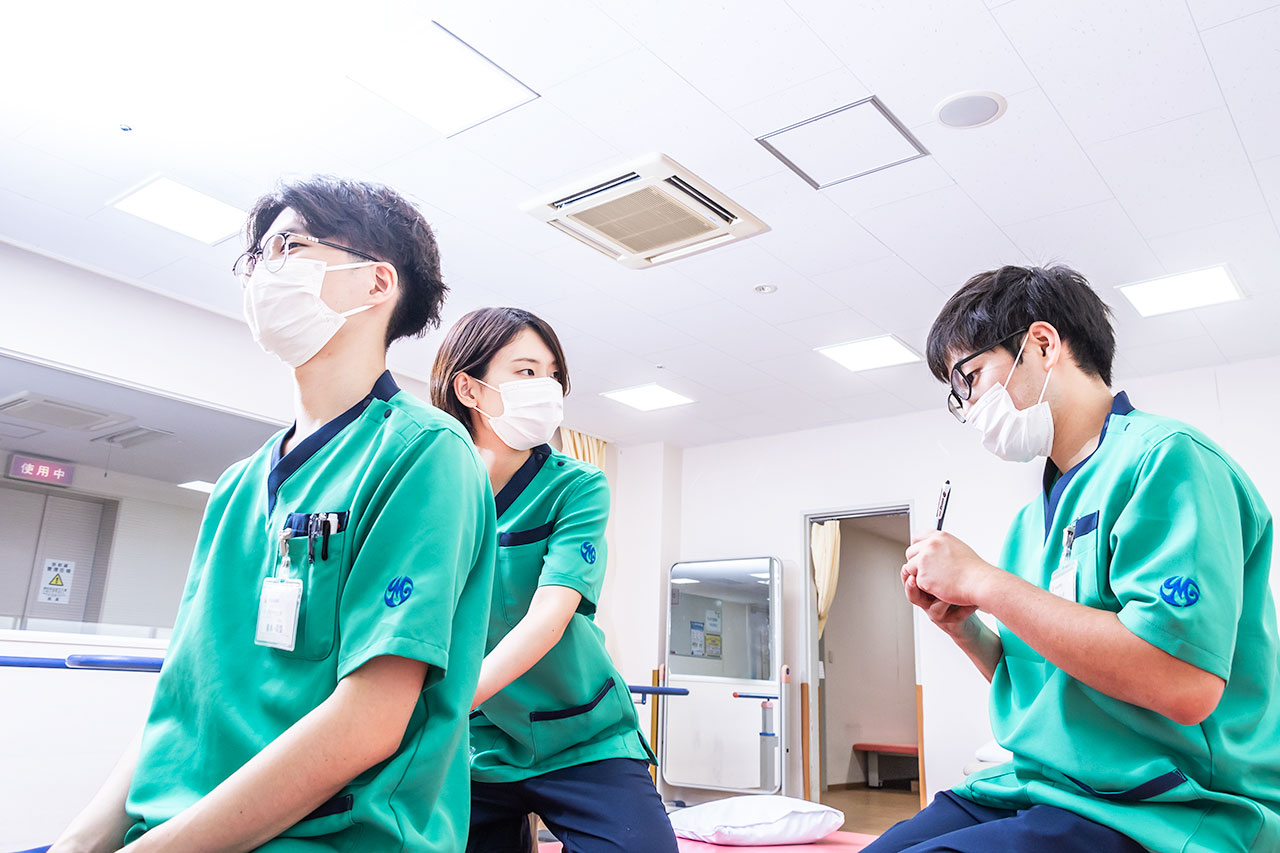 リハビリテーション科では、月に1回ほど実技中心の勉強会を行い、日々の業務に役立つ知識や技術を学んでいます。また、新人教育にも力を入れており、グループ内の病院と協力して、年間約30項目の研修を実施。基礎から応用まで段階的に学べる内容で、無理なくステップアップできる仕組みになっています。スタッフ全員が安心して成長できるよう、日常の中で学べる環境づくりを大切にしています。