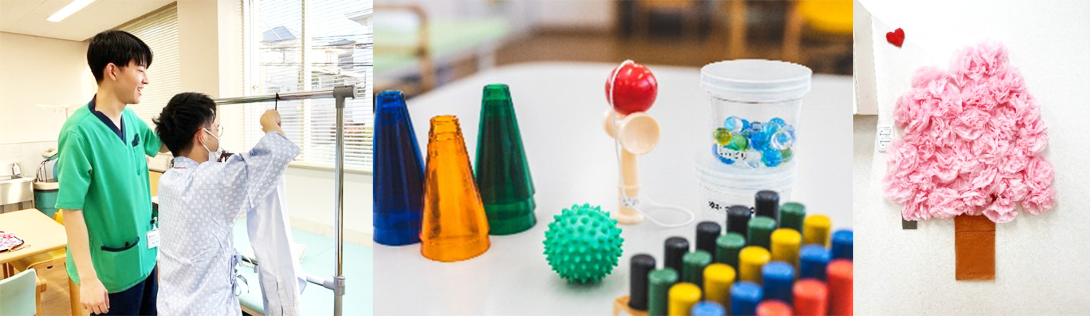 作業療法士(Occupational Therapist:OT)は、身体または精神に障害のある方に対し、応用的な動作能力や社会適応能力の回復を目指して、手芸や工作などの作業を通じて生活の質の向上を支援する専門職です。当院では、病棟看護師と連携しながら、身辺動作や高次脳機能の回復支援はもちろん、家事や趣味活動など患者様のニーズに合わせた支援を行い、患者様とご家族の生活がより豊かになるよう関わっています。また、個別リハビリに加えて、当院の地域包括ケア病棟リハビリテーション(CARB:Comprehensive and Rehabilitation-based Care)プログラムの一環として、集団リハビリも実施しています。複数名のグループでストレッチや体操、創作活動などを行い、運動機能や認知機能の向上に努めています。さらに、自宅復帰に向けた支援として、患者様のご自宅へ訪問し、福祉用具やサービスの調整も行っております。